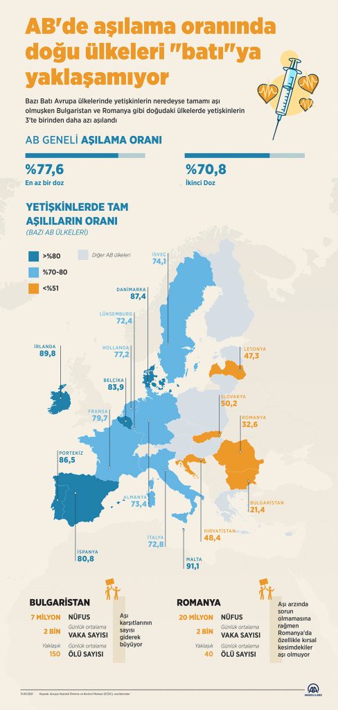 Aşılamanın en düşük olduğu Bulgaristan’da yetişkinlerin yüzde 21,4’ü, Romanya’da 32,6’sı, Letonya’da yüzde 47’3’ü, Hırvatistan’da yüzde 48,4’ü, Slovakya’da yüzde 50’2’si aşılandı.