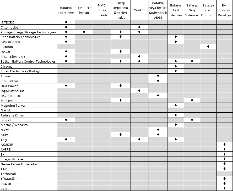 - Türkiye’nin hücre üretimi ve hammaddede pazar derinliği yaratamadığı görülmektedir. Bunun yanı sıra ESS veya elektrikli araç bataryalarının tescili için yetkili ve donanımlı, uluslararası yeterliliğe sahip ve tanınmış test laboratuvarlarına ihtiyaç olduğu belirtilmektedir.