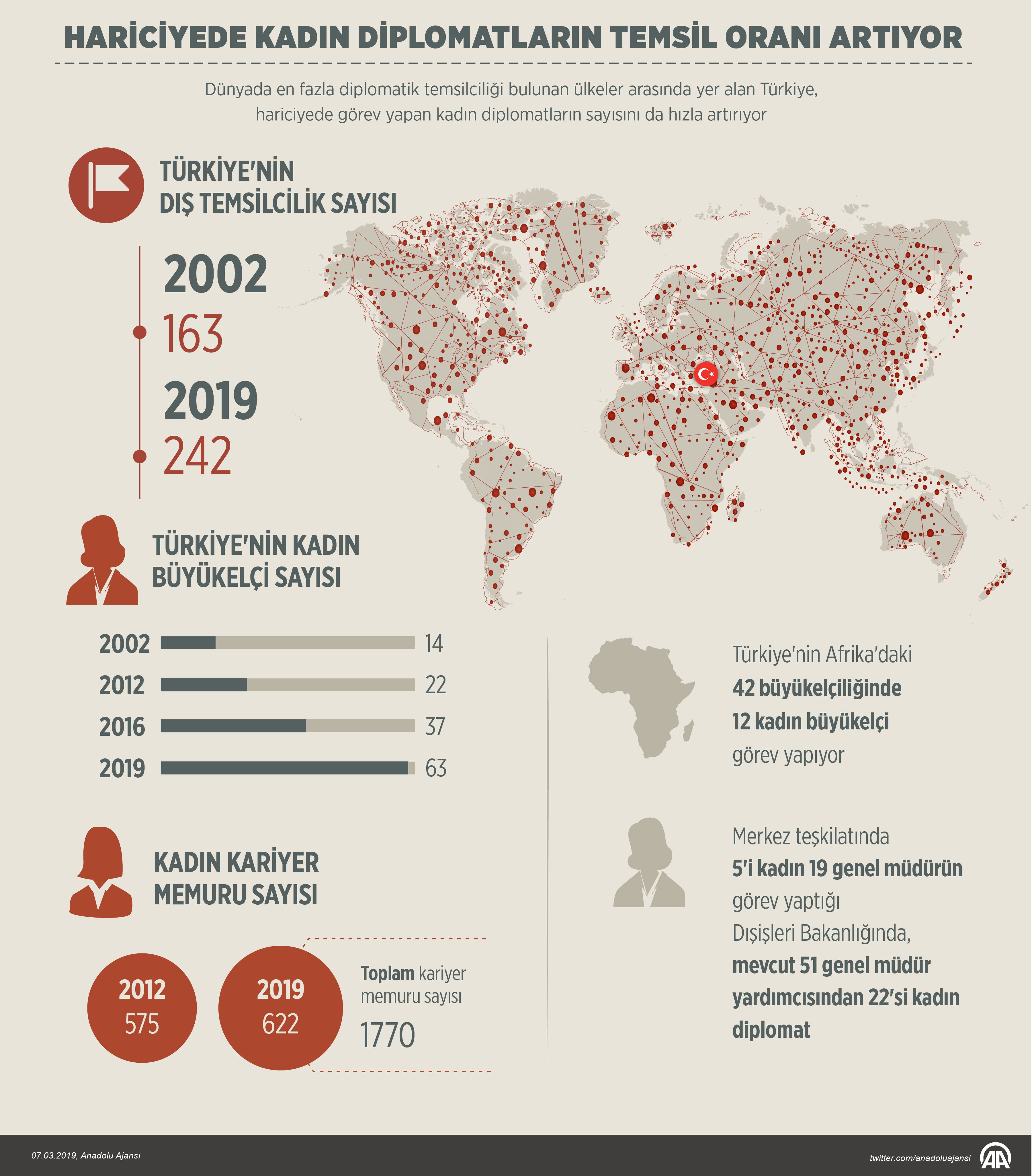 Kadın büyükelçi sayısı 2002'de 14 iken, bu rakamın 2016'da 37'ye, 2019'da ise 63'e ulaştığını bildiren kaynaklar, 6'sı siyasi atama olmak üzere yurt dışında görevde bulunan kadın misyon şefi sayısının 37 olduğunu kaydetti.