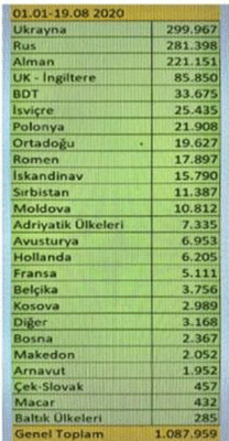 Rusya 281 bin 398, Almanya 221 bin 151, İngiltere 85 bin 850, BDT ülkeleri 33 bin 675, İsviçre 25 bin 435, Polonya 21 bin 908, Ortadoğu 19 bin 627, Romanya 17 bin 897, İskandinav 15 bin 790, Sırbistan 11 bin 387 ve Moldova 10 bin 812.