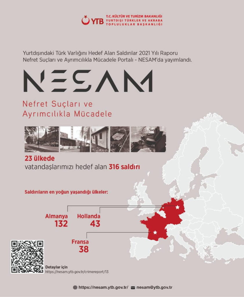 Yurtdışı Türkler ve Akraba Topluluklar Başkanlığı tarafından Türkçe, İngilizce, Almanca ve Fransızca olarak 4 dilde hazırlanan Yurt Dışındaki Türk Varlığını Hedef Alan Saldırılar raporlarına kurumun Nefret Suçları ve Ayrımcılıkla Mücadele Portalı ‘‘nesam.ytb.gov.tr’’ adresinden ulaşılması mümkün. NESAM portalı, YTB tarafından tutulan istatistiklerin yanı sıra, vatandaşlara yurt dışında yaşadıkları vakaları kuruma bildirme ve pek çok ülkenin bu alandaki hukuki bilgilerine ulaşma imkânı da sağlıyor.