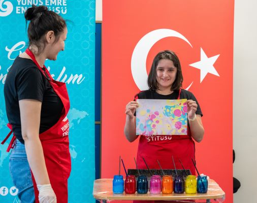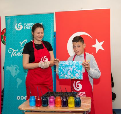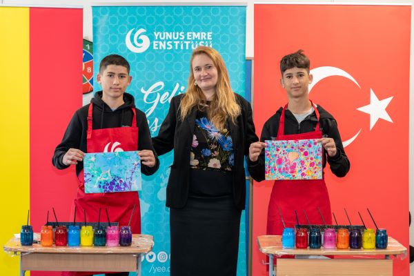 Çocuklar, T.C. Köstence Başkonsolosu Ozan Çakır ve Yunus Emre Enstitüsü Romanya Koordinatörü Mustafa Yıldız’ın da katılımıyla düzenlenen Ebru Sanatı Atölyesinde renklerin suyla dansını keşfettiler.