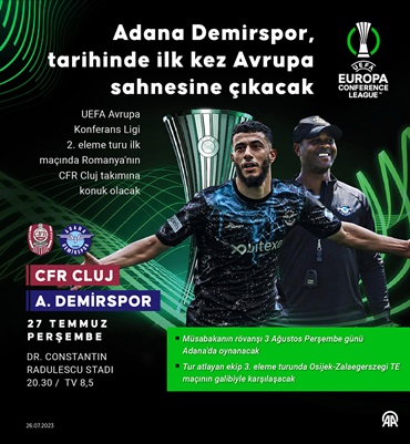 Adana Demirspor-CFR Cluj eşleşmesinde tur atlayacak taraf, UEFA Avrupa Konferans Ligi 3. eleme turunda Osijek (Hırvatistan)- Zalaegerszegi TE (Macaristan) eşleşmesinin galibiyle karşılaşacak.
