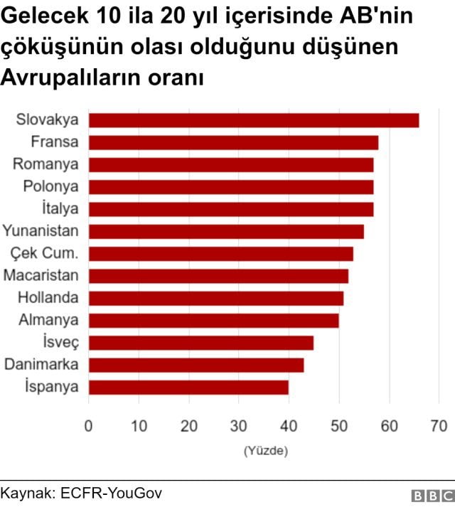 YouGov'un Avrupa Birliği'nin (AB) 14 üye ülkesinde yaptığı araştırmaya göre, Avrupalıların yarısından fazlası Avrupa Birliği'nin 10-20 yıl içinde dağılabileceğine inanırken, Fransa ve Polonya'da 3 kişiden biri ise AB'de savaş çıkabileceğini düşünüyor.