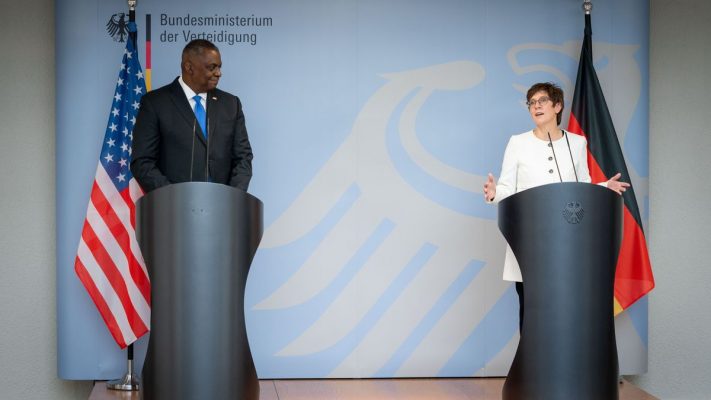 Almanya Savunma Bakanı Annegret Kramp-Karrenbauer ve ABD Savunma Bakanı Lloyd Austin, 13 Nisan 2021'de Almanya'nın Berlin kentinde Savunma Bakanlığı'nda yapılan görüşmelerin ardından ortak bir basın toplantısı yaptılar.