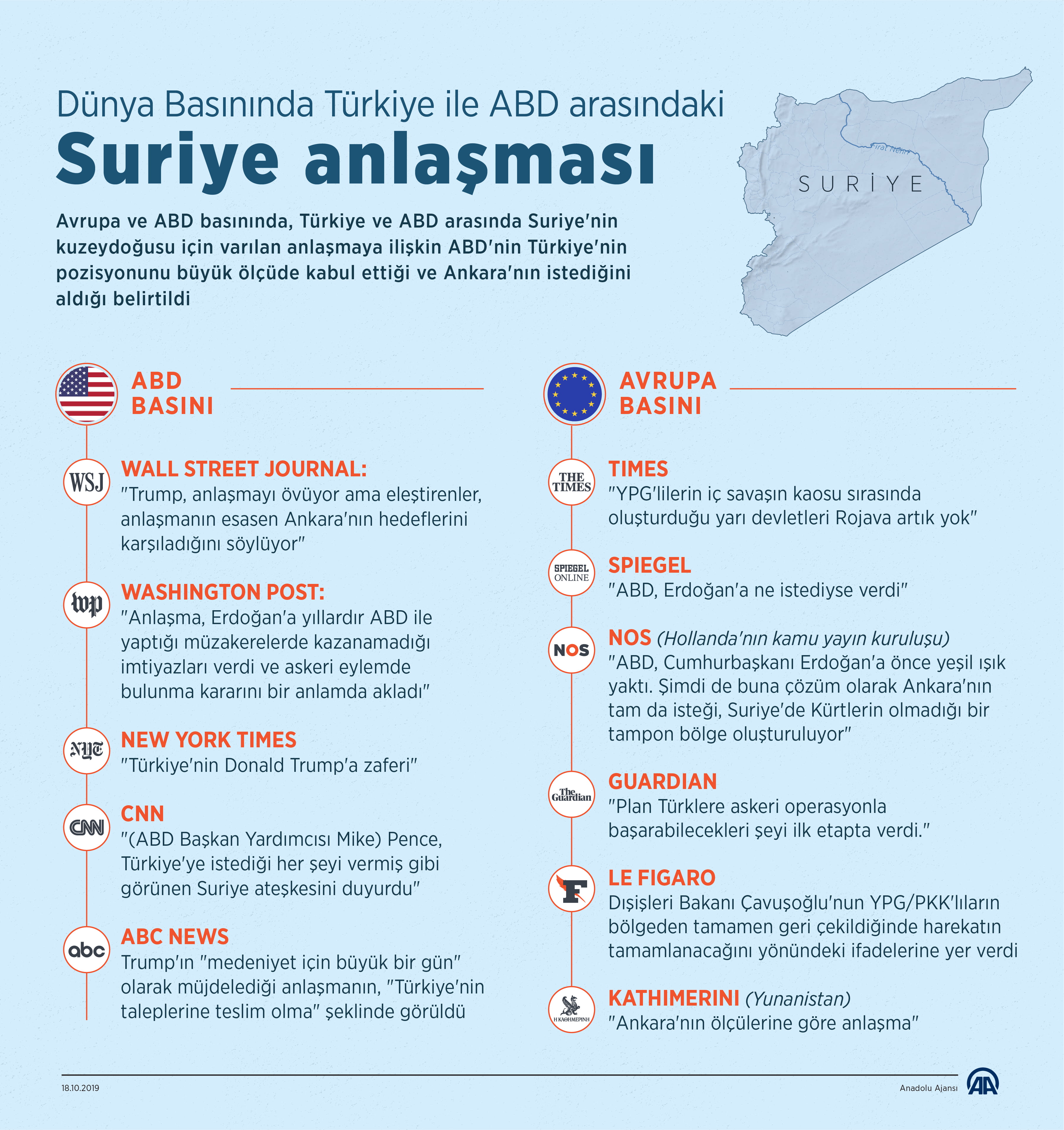 Kamu yayın kuruluşu NOS'un haberinde, "ABD, Cumhurbaşkanı Erdoğan'a önce yeşil ışık yaktı. Şimdi de buna çözüm olarak Ankara'nın tam da isteği, Suriye'de Kürtlerin olmadığı bir tampon bölge oluşturuluyor." denildi.
