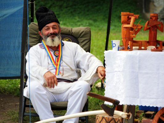 Fotoğraf: BRAN CASTLE, ROMANYA / 8 Ağustos 2018: Oyma ahşap oyuncaklar ve hediyelik eşya satan geleneksel Romen giysili yaşlı bir adam