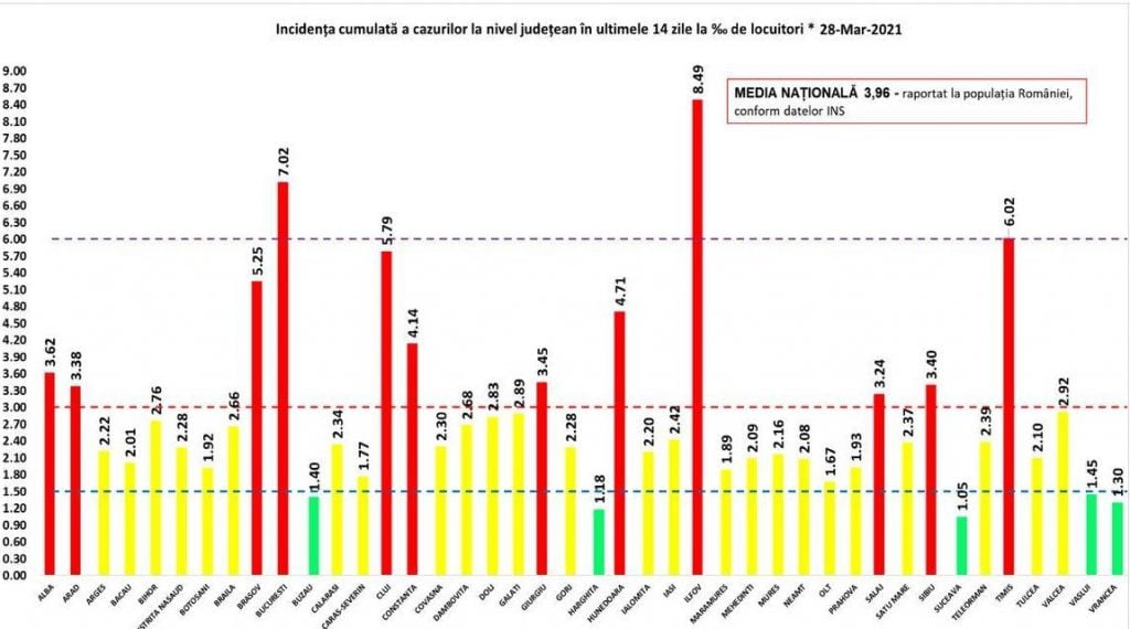 Sarı bölgede olan 25 ilde ise Pazar günü salgının yayılma oranı (binde 1,5 ile 3 arasında), Vâlcea’da 2.92, Dolj’da 2.83, Galaţi’de 2.89, Bihor’da 2.76 ve Dâmboviţa’da 2.68 oldu.