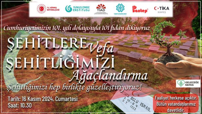 “T.C. Bükreş Büyükelçiliği himayelerinde, Yunus Emre Enstitüsü organizasyonuyla, Türk İş Adamları Derneği (TİAD), Maarif Vakfı, Pantep ve TİKA Bükreş'in destekleriyle Bükreş Türk Şehitliğimizde Milli Ağaçlandırma Günü kapsamında fidan dikme etkinliği düzenlenecektir. Gönüllü olarak sizler de görev almak isterseniz aşağıdaki formu doldurabilir faaliyete katılabilirsiniz.