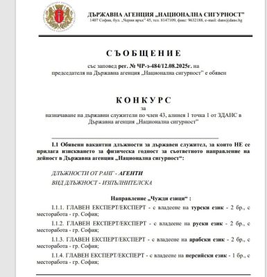 Bulgaristan’ın istihbarat kurumu Devlet Ulusal Güvenlik Ajansı (SANS), yeni personel alımı için ilan yayımladı. Kurumun resmi internet sitesinde yer alan duyuruya göre, ajans özellikle Türkçe, Arapça, Farsça ve Rusça dillerinde yetkin adaylar arıyor.