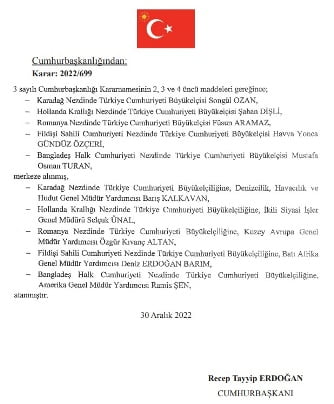 Resmi Gazetede yayımlanan 2022/699 sayılı atama kararıyla, Bükreş Büyükelçisi Füsun Aramaz, Hollanda Büyükelçisi Şaban Dişli, Karadağ Büyükelçisi Songül Ozan, Fildişi Sahili Büyükelçisi Havva Yonca Gündüz Özçeri ve Bangladeş Büyükelçisi Mustafa Osman Turan olmak üzere beş büyükelçi merkeze alındı.