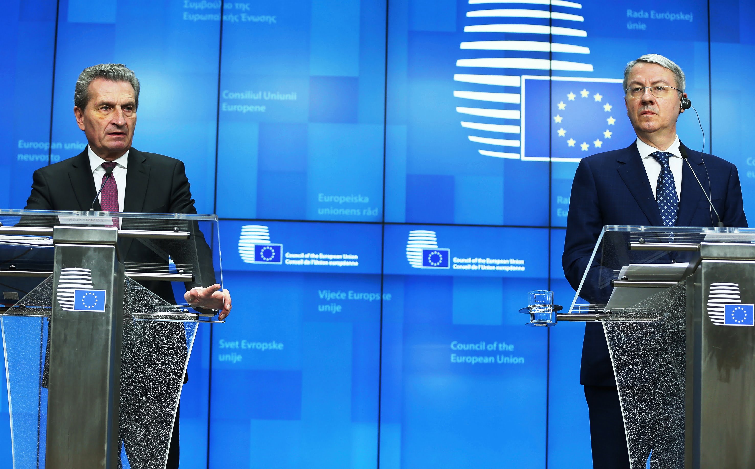 AB Genel İşler Toplantısına katılan Romanya'nın AB Bakanı George Ciamba, AB Komisyonu'nun bütçeden sorumlu üyesi Günther Oettinger, Brüksel'de basın toplantısı düzenledi.