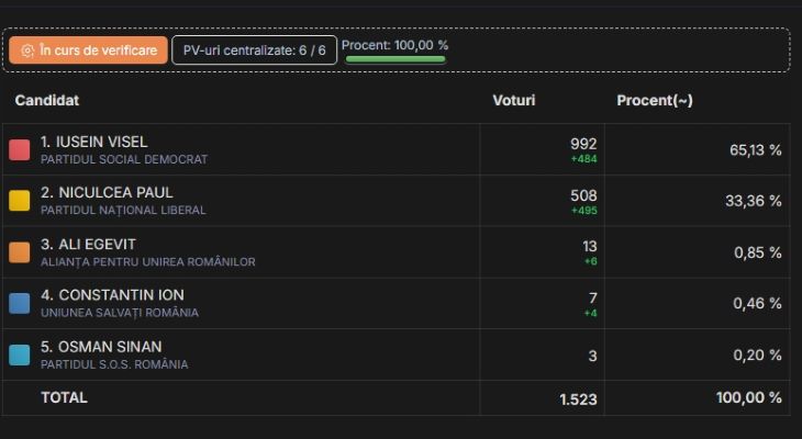 2.603 seçmeninden 1.532’sinin oy kullandığı seçimi 992 (%65,13) oy alan Iusein Visel kazanırken en yakın rakibi Paul Niculcea (PNL) ise 508 (%33,36) oy aldı.