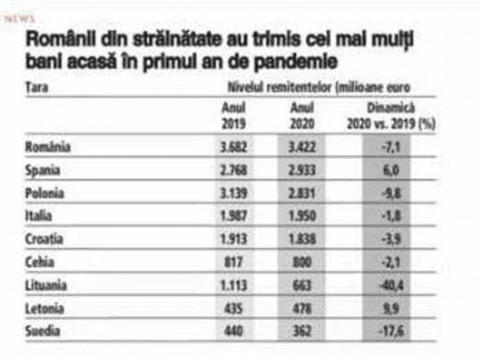 *Eurostat verilerine göre, AB ülkelerinde çalışan Rumenler geçen yıl Romanya’ya resmi olarak 3.4 milyar euro gönderdi. İkinci sırada 2,9 milyar avro ile İspanyollar, üçüncü sırada ise 2,8 milyar avro ile Polonyalılar yer aldı