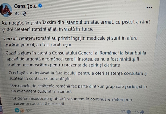 Romanya Dışişleri Bakanı Oana Țoiu, Facebook sayfasında yaptığı açıklamada, cumartesi gecesi İstanbul'da Taksim Meydanı'nda meydana gelen silahlı saldırıda iki Rumen vatandaşının yaralandığını duyurdu. İki Rumen vatandaş, şehirde düzenlenen kültürel bir etkinliğe katılan bir grup vatandaşıydı.