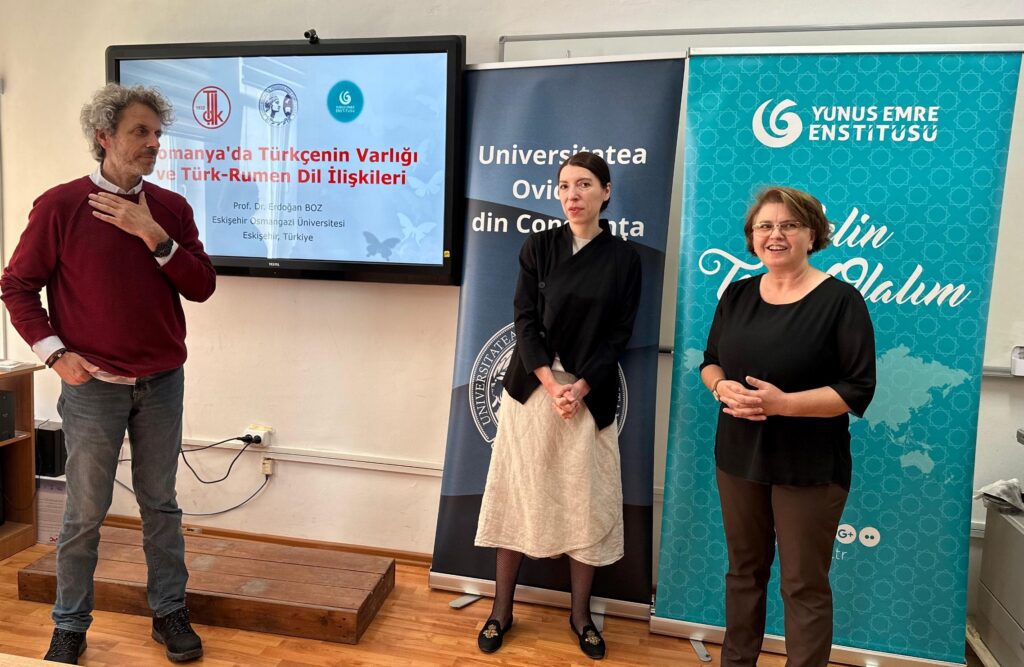 Yunus Emre Enstitüsü ve Köstence Ovidius Üniversitesi Edebiyat Fakültesi tarafından, Türk Hava Yolları ve Türk Dil Kurumunun katkılarıyla gerçekleştirilen “Romanya’daki Türkçe Varlığı, Türk-Rumen Dil İlişkileri” konulu konferans, Eskişehir Osmangazi Üniversitesi Yeni Türk Dili Anabilim Dalı Başkanı Prof. Dr. Erdoğan Boz tarafından verildi.