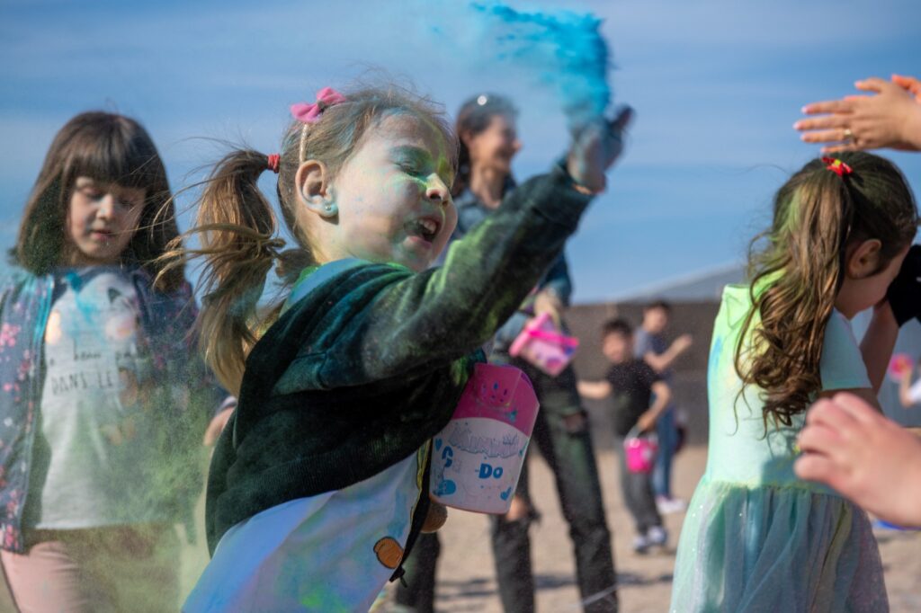 Şölen toz boya savaşı ile devam ederken rengarenk boyaları birbirine atan çocuklar çok eğlendi.