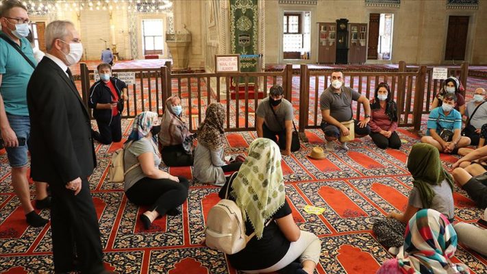 Edirne’nin çiçeği burnundaki Müftüsü Alettin Bozkurt da turistlere maske, mesafe ve hijyen konusunda bilgilendirme yaptı ve kurallara uydukları için teşekkür etti.
