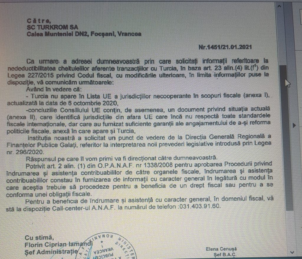 Focşani’de faaliyet gösteren TURKROM firması Romanya Gelir İdaresi’ne (ANAF) bir yazı yazarak ne yapacaklarını sordu. Aldığı cevap, “Biz de bilmiyoruz. Bir üst makama sorup bilgi vereceğiz. Zaten Türkiye kanunun ekindeki 2. Listede yer alıyor. O listede bulunan ülkelerle ilgili görüşmeler devam ediyor” minvalinde oldu.