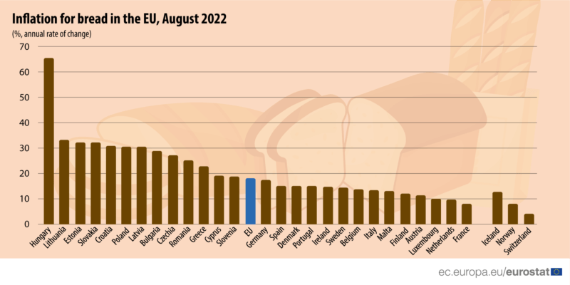 Avrupa İstatistik Ofisi Eurostat'ın Pazartesi günü Lüksemburg'da yaptığı açıklamada, Ağustos 2021 ile Ağustos 2022 arasında geçen bir yılık sürede ekmek fiyatlarının AB'de ortalama yüzde 18 arttığı belirtildi. Bir önceki yıl Birlik genelindeki artış yüzde 3 olarak kayıtlara geçmişti.