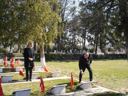 Büyükelçi Aramaz ve TSK Ataşesi Dilsiz ile diğer katılımcılar şehit kabirlerine gül bırakarak dua ettiler. Büyükelçi Aramaz Şehitlik defterine yazdı.