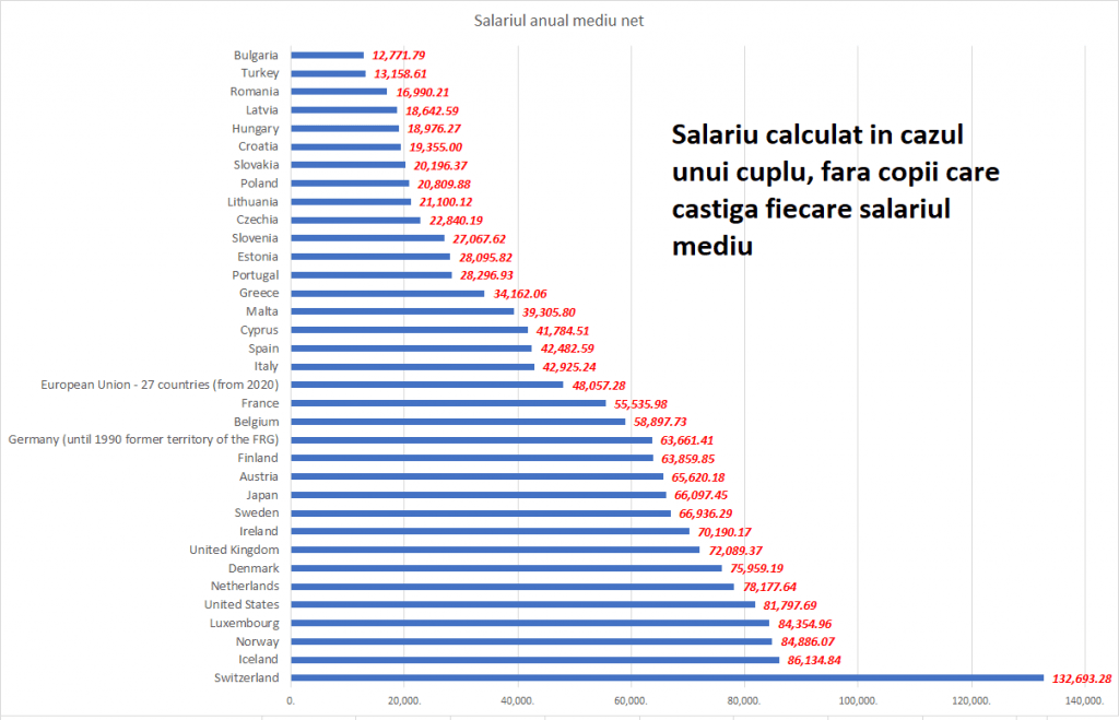 Eurostat'a göre Avrupa'da ücretler aşağıdaki tabloya benziyor. Bu, çocuksuz bir çiftin 2020'de aldığı, avro cinsinden hesaplanan, yıllık ortalama net maaşı: