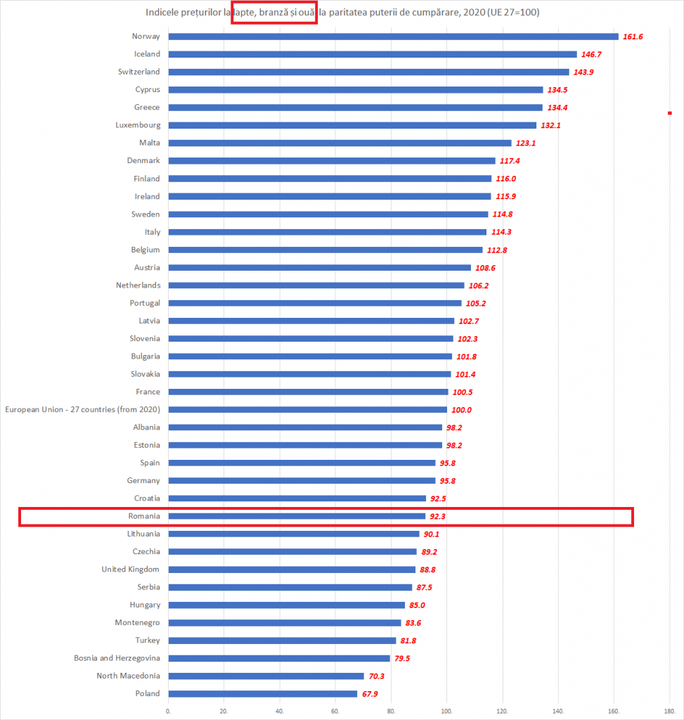 Aynı şey süt, peynir ve yumurta için de geçerlidir: Romanya'da fiyatlar Litvanya, Çek Cumhuriyeti, Macaristan ve diğer birkaç ülkedeki fiyatları aşmaktadır.