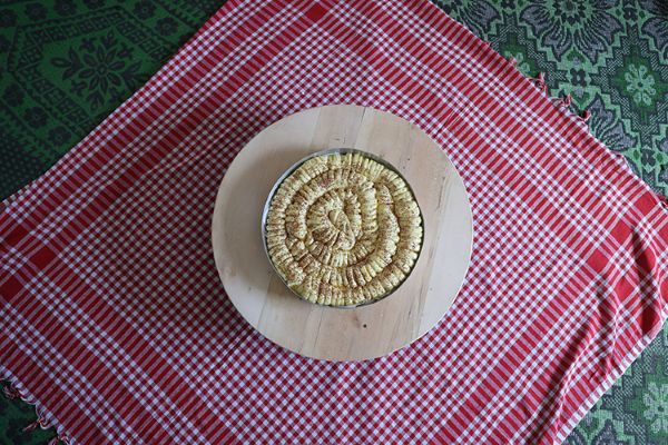 Yuvarlanan parçalar yassılaştırılır, ortasına lor konulup kapatılır.
