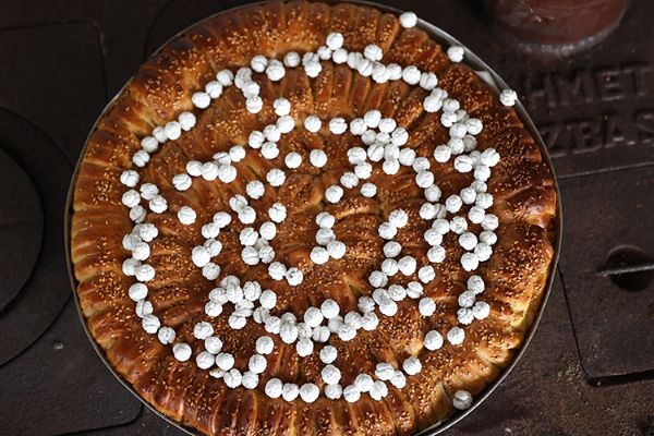 Üzeri için hazırlanan yoğurtlu sos çırpılır ve kaşıkla hamurların üzerine dökülür. İsteğe göre susam veya çörek otu serpilir.