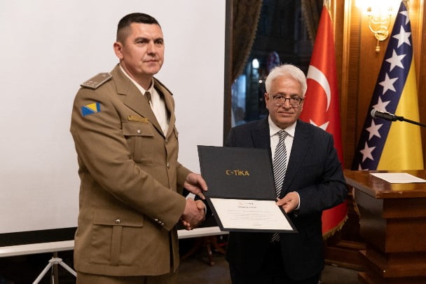 TİKA'nın arama kurtarma ekiplerine yönelik verdiği eğitimlerin devam edeceğini aktaran Çevik, Bosna Hersekli ekiplere teşekkür belgesi takdim etti.