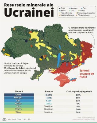 Bursa.ro’nun aktardığına göre visualcapitalist.com, Ukrayna'nın zengin kaynaklarına erişimin ABD tedarik zincirlerini güçlendirebileceğini ve nadir toprak işlemede baskın olan Çin'e olan bağımlılığı azaltabileceğini belirtiyor. Ancak, Rusya ile devam eden çatışmanın ortasında yatırım ve istikrarlı çıkarmayı güvence altına almak hala bir zorluk var.