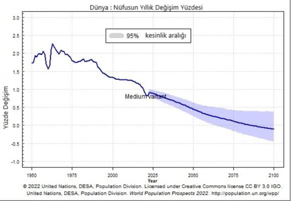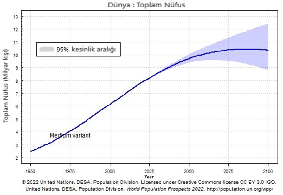 İlk bakacağımız grafik %95 güvenilirlik payıyla dünya nüfusunun gelecekte alacağı değeri veren Şekil 1’de yer alıyor. Bu grafikte dünya nüfusunun 1950’den bu yana gelişimini aynı zamanda 2100 yılına kadar da öngörüsel olarak ne kadar büyüyeceğini görüyoruz. Birleşmiş Milletler'e göre dünya nüfusu 2075 yılından sonra 10 milyar civarında sabitlenecek ve 2100 yılına hafif de olsa bir azalmayla girilecek. Bu öngörüde sıradışı büyük felaketlerin veya olağanüstü etkilerin değerlendirilmediğini unutmamamız gerekiyor yani aslında grafik ortalama doğum ve ölüm hızlarının bir bileşkesi olarak oluşturulmuş. En kötümser senaryoda 9 milyarın altına inebilirken en pozitif senaryoda 12 milyarın üstüne çıkması da söz konusu. Elimizde tutmamız gereken birinci veri bu.