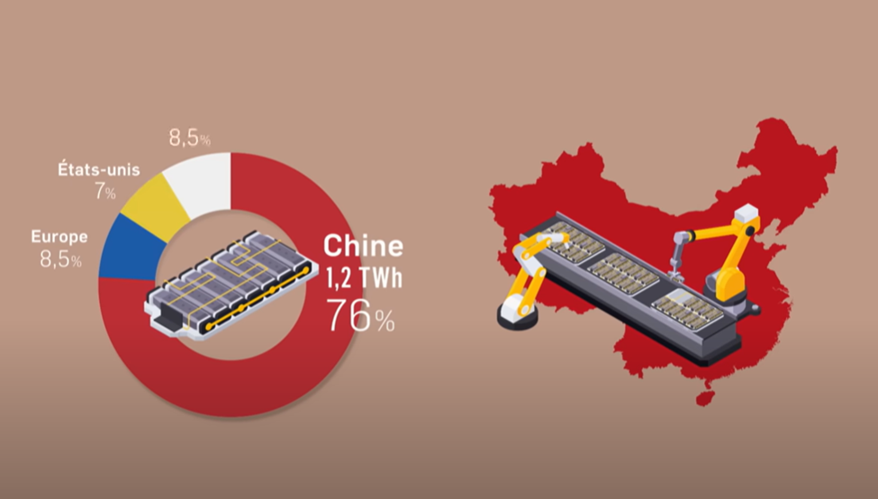 Şekil 2 - Çin'in batarya imalatındaki kapasitesinin pazara olan hakimiyetinin grafik ifadesi. Dünyadaki toplam lityum-iyon batarya imalat kapasitesinin % 76'sı Çin'de, % 8,5'u Avrupa'da, % 7'si ABD'de ve geri kalan % 8,5'u dünyanın diğer bölgelerinde yer alıyor. Bu durumda elektrikli otomobil imal edecek üreticilerin kullandıkları bataryalar için Çinli üreticilerin kapısını çalmaları gerekmektedir. Kaynak : ARTE