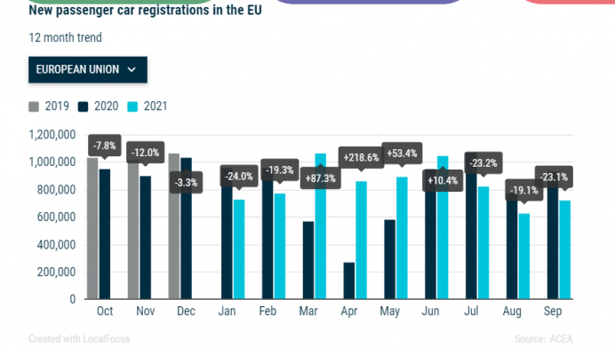 Avrupa’da trafiğe yeni çıkan araçların sayısındaki gelişimi aylık olarak bu grafikte görebiliyoruz. 2021’in Haziran ayından itibaren sert bir düşüş görülüyor. Gelen ilk bilgilere göre Ekim ayında da süren bu düşüş yüzde 30 civarında bir daraltmaya yaklaşıyor. Bunun sebebinin de araç imalatında elektronik parça eksikliğine bağlı imalat kaybı olduğu biliniyor.