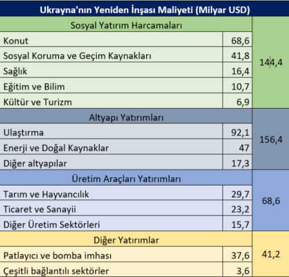 Bunun alt harcama kalemlerine baktığımız tabloda inşaat kalemlerinin önemli bir miktar tuttuğu gözükse de, en az onlar kadar önemli miktarda imalat ve ticaret yatırımlarının söz konusu olduğunu görüyoruz. bu vesileyle ve geleceğe hazırlanmak adına Türk ve Romen ekonomi aktörlerinin inşaatın yanı sıra imalat ve ticaret ürünlerine de hazırlanmaları faydalı olacaktır. Bu büyüklükte bir pazar örneğin Türk makine imalatçılarının önünü açabilecektir. Türkiye veya Romanya'da yapılabilecek bir imalat faaliyetiyle Ukrayna pazarının derinliğinden faydalanarak Avrupa pazarına kapı açmak söz konusu olabilecektir. Aynı zamanda savunma sanayinin de savaş sonrasındaki yeniden yapılanmada yer alması söz konusudur. Buradaki faaliyet bir yandan Ukrayna ordusunun yenilenmesi diğer yandan da savaş artığı malzemenin bertaraf edilmesi şeklinde olacaktır. Toplamda 400 milyar dolar olarak hesaplanan bu maliyet tabii ki kısa dönemli bir maliyet olmayacak ancak Ukrayna'nın yeniden yapılanma sürecinin ne kadar önemli bir pazar büyüklüğü yaratacağının da fikrini verecektir.