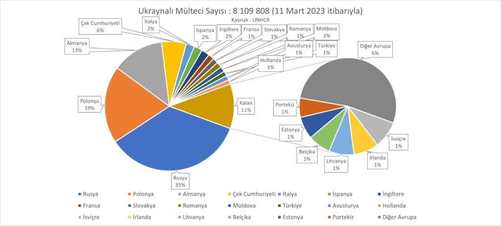 Savaşın en dramatik yanı tabii ki insani boyutuyla ortaya çıkıyor. Rus saldırısının sonrasında 2023 Mart ayına kadar 8 milyondan fazla Ukraynalının mülteci olarak diğer ülkelere geçti bildiriliyor. UNHCR’dan Alınan bilgiye göre bu mültecilerin %35’i Rusya'ya %19’u Polonya’ya, %13’ü Almanya'ya, % 6’sı Çek Cumhuriyeti'ne ve geri kalanı da birçok Avrupa ülkesine dağılmış durumda. Görüldüğü gibi aslında yoğun biçimde paylaşılan bir ortak kültürün 2 ülkesi savaşır durumda. Türkiye ve Romanya sırasıyla 96.000 ve 110.000 mülteci yine paylarına düşen %1 mülteciyi kabul ettiler. Savaşın sona ermesinden sonra bu insanların ne şekilde yurtlarına geri döneceği tahmin edilebileceği gibi henüz bilinmiyor.