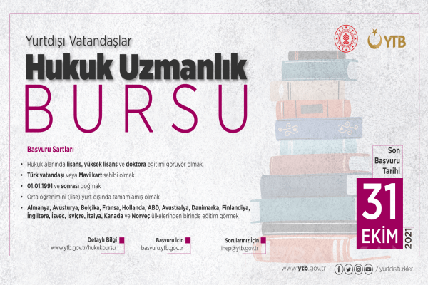 Yurtdışı Türkler ve Akraba Topluluklar Başkanlığı (YTB), yurt dışında yaşayan hukuk öğrencilerinin eğitim hayatlarındaki başarılarını desteklemek için her yıl “Hukuk Alanında Uzmanlık Bursu” programını ilan ediyor.