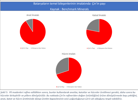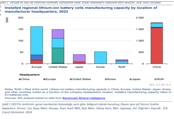 Bilindiği üzere 2010’lu yıllardan bu yana Çin hükümeti stratejik bir karar alarak elektrikli araçların geliştirilmesi, üretilmesi ve pazarda güçlü bir şekilde yer alması için önemli teşvikler sağlamıştır. Tabii ki, Çin'in yönetim sistemi nedeniyle, sadece teşvik vermekle kalmadılar, aynı zamanda kamu iktisadi teşebbüslerine de bu yönde çalışmaları için direktifler verdiler. Çinli şirketlerin elektrikli araç teknolojisinde ilerlemeye başladığı bir dönemde Renault, Avrupa'daki ilk seri elektrikli araç satışını ZOE ile gerçekleştiriyordu ancak hibrit araçlar yerine elektrikli araçlar ürettiği için de eleştirilmişti. Diğer Avrupalı üreticiler ise Mercedes örneğinde olduğu gibi Tesla ile ortaklık kurarak ya da Peugeot örneğinde olduğu gibi değişimi görmezden gelerek beklediler. Şimdi, açığı kapatmak için Avrupa'da yoğun bir şekilde batarya fabrikaları inşa ediliyor. Ancak bu fabrikalar 2 sebepten dolayı arzu edilen hızda ilerleyemiyor. Zorluğun ilk kısmı, büyük finansal kaynaklara duyulan gereksinim ve ikinci kısmı, rekabet edebilecek ürünü elde etmek için yoğun mühendislik çalışmalarına duyulan ihtiyaçtır. Şekil 2'ye baktığımızda, 2023 yılında bölgesel olarak kurulan lityum iyon pil hücresi üretim kapasitesinin üreticinin genel merkezinin konumuna göre dağılımını görüyoruz. Burada, Çin topraklarında kurulu kapasite, sağdaki diğerlerinden ayrı olarak verilmiştir. Bu şekilde ayrılmasının nedeni, 2 grafiğin eksenlerindeki boyut farkıdır. Avrupa ve Amerika'daki mevcut kurulu kapasiteler her ikisinde de 150 gigavat civarındadır. Çin'deki kurulu kapasite neredeyse 2000 giga watt'a ulaşıyor. Bu farka baktığımızda Çin'in Avrupa ve Amerika'ya göre 8 kat daha fazla batarya hücresi üretim kapasitesine sahip olduğunu görüyoruz. Ayrıca Avrupa'daki kurulu kapasiteye baktığımızda mevcut üretim birimlerinin Güney Koreli veya Çinli üreticilere ait olduğunu net bir şekilde görebiliyoruz. Dolayısıyla yukarıda da belirttiğimiz gibi Avrupa hükümetlerinin elektrikli araçlara verdiği teşvikler bugün itibariyle ya Çinli otomobil yöneticilerine ya da Çinli ya da Güney Koreli batarya üreticilerine fayda sağlıyor. Bu anlamda teşviklerin yavaşlatılması Avrupa için mantıklı görünüyor. Şekil 3, katot ve anot üretim kapasitelerinin sırasıyla %78 ve %91'inin ve ayrıca batarya hücresi üretiminde dünya kapasitesinin %70'inin Çin'de kurulu olduğunu göstermektedir. Avrupa Birliği'nin kendi üretim kapasitesini geliştirmeden elektrikli araçlara vereceği teşviklerin, Çinli üreticilerin hem katot hem de anot ve batarya üretiminde desteklenmesi anlamına geleceği açıkça görülmektedir.