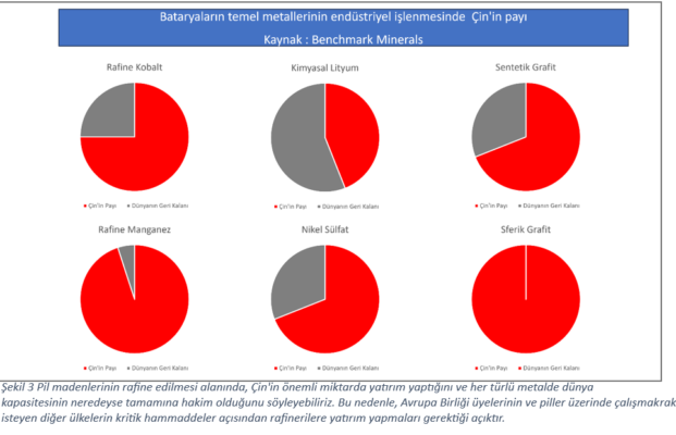 Yukarıdaki paragrafta bahsettiğimiz 2010’lu yıllarda stratejik kararların alındığı dönemlerde, Çin hükümeti de batarya teknolojisi için gerekli olan minerallerin tedariki için büyük ölçekli uluslararası anlaşmalar imzalamışlardı. Bu adımlar, Çin ve Avrupalı üreticiler arasındaki uçurumu genişletirken, o dönemde Avrupa'da Renault markası dışında kimse elektrikli otomobil üretmiyordu. Araştırma kuruluşu Benchmark Minerals'in 2022 yılı sonu itibarıyla verdiği bilgilere göre, Çin Halk Cumhuriyeti'nin batarya mineralleri üzerindeki hakim durumu Şekil 3'te gözlemlenebilir. Çin'in lityumdaki hakimiyeti hakkında birçok bilgi kaynağında okumuş olabilirsiniz. Buradaki verileri incelediğimizde Çin'in aslında lityumun çıkarılmasında değil, işlenmesinde baskın konumda olduğunu görebiliyoruz. Benchmark Minerals'e göre, 2022 yılı sonu itibariyle Çin'in dünya lityum madenciliğindeki payı sadece %13'tür. Ancak iş lityum madeninin işlenmesi (rafine edilmesi) ve kimyasal olarak kullanılabilir hale getirilmesine geldiğinde, Çin'in %44'lük bir hakimiyet seviyesine ulaştığını görüyoruz. Buna kobalt tarafından bakalım. Dünya kobalt madenlerinin % 1’den daha azına sahip olan Çin, 2010'lu yıllarda yaptığı yatırımlarla kobalt işleme kapasitesinin %70'ine sahip bir konuma ulaşmıştır. Bundan çıkarılacak 2 sonuç var: Birincisi, Avrupa Birliği'nin cevher tedariki için Çin'e bağımlı olması gerekmiyor, buradaki tek istisna grafit gibi görünüyor. Bununla birlikte, Çin'in maden cevheri işleme konusundaki yetkinliğine ulaşmak için Avrupa Birliği içinde önemli miktarda yatırıma ihtiyaç vardır. Avrupa Komisyonu'nun önümüzdeki dönemde vereceği teşviklerde bu kimyasal rafineri konusuna önem vermesi beklenmelidir.