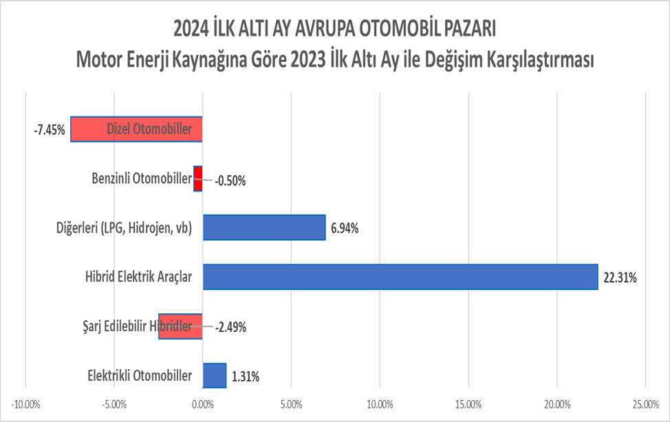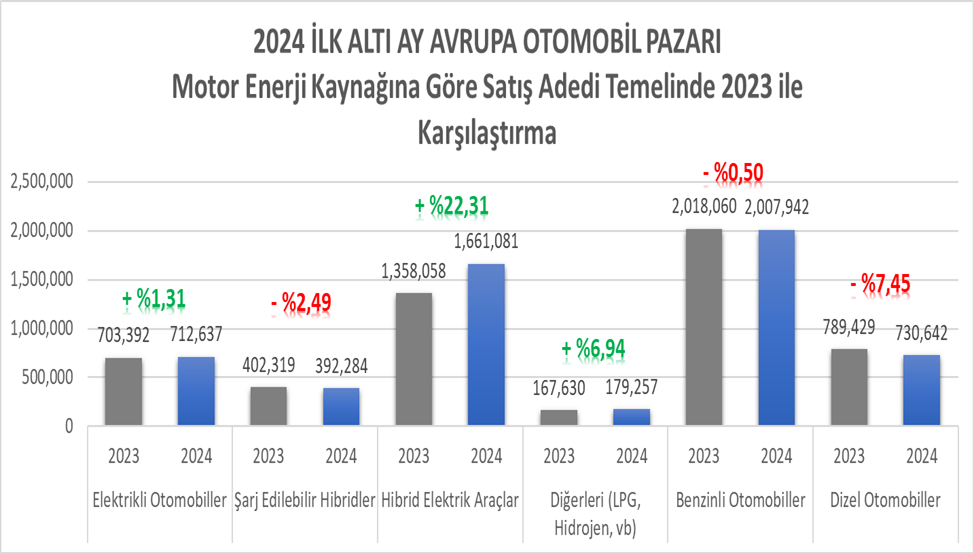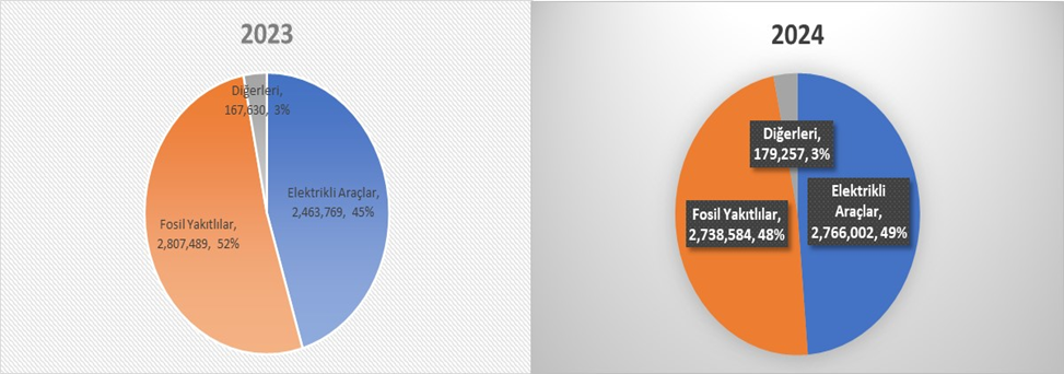 - Dizel ve benzinli araçların pazardaki payının düşmeye devam ettiği teyit ediliyor. 2023’de %52 olan payları 2024’de %48’e gerilemiş.